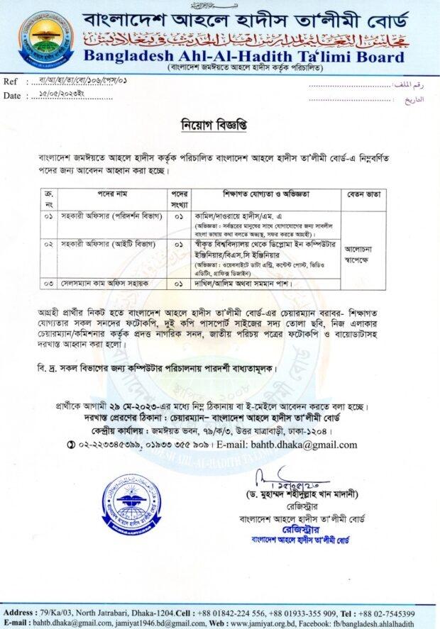 নিয়োগ বিজ্ঞপ্তি: বাংলাদেশ জমঈয়তে আহলে হাদীস কর্তৃক পরিচালিত বাংলাদেশ আহলে হাদীস তা’লীমী বোর্ড-এ নিম্ন বর্ণিত পদের জন্য আবেদন আহ্বান করা হচ্ছে