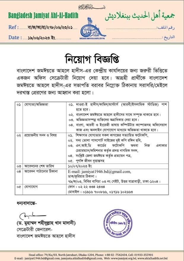 নিয়োগ বিজ্ঞপ্তি: বাংলাদেশ জমঈয়তে আহলে হাদীস-এর কেন্দ্রীয় কার্যালয়ের জন্য জরুরী ভিত্তিতে একজন অফিস সেক্রেটারী নিয়োগ দেয়া হবে। আগ্রহী প্রার্থীকে বাংলাদেশ জমঈয়তে আহলে হাদীস-এর সভাপতি বরাবর নিম্নোক্ত ঠিকানায় সরাসরি/মেইলে দরখাস্ত প্রেরণের জন্য আহ্বান করা হলো। যোগ্যতা/অভিজ্ঞতা: ০১. দাওরা-ই হাদীস/কামিল/ মাস্টার্স ( আরবী/ইসলামিক স্টাডিজ) পাশ হতে হবে। ০২. বাংলাদেশ জমঈয়তে আহলে হাদীসের সাথে সম্পৃক্ত থাকতে হবে। ০৩.…